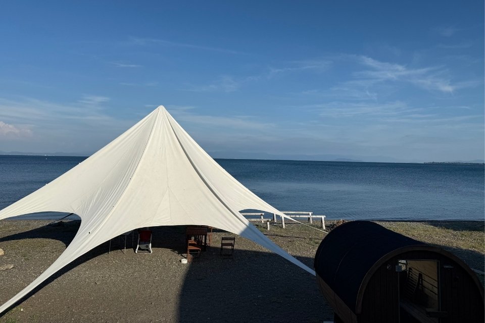 穏やかな湖面を滑るSUP体験や、汗を流してクールダウンできるサウナも用意(営業・受付方法は要確認)。