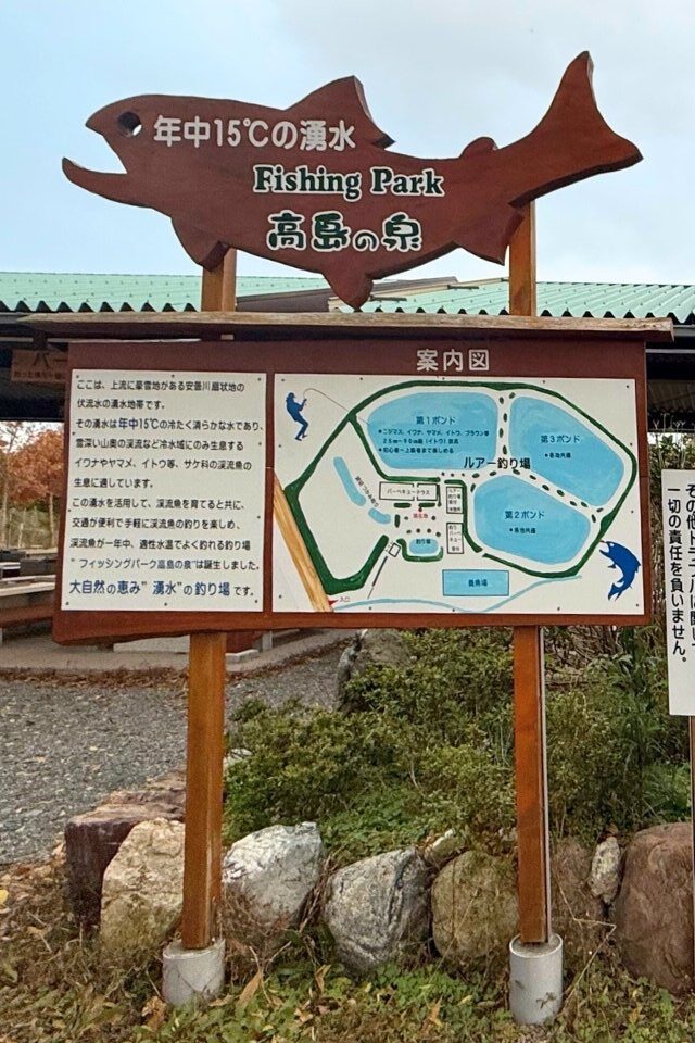 豊かな湧水をいかしたルアー専用エリアと釣り堀、さらに屋根付きの大規模BBQまで楽しめる「フィッシングパーク高島の泉」へ。
